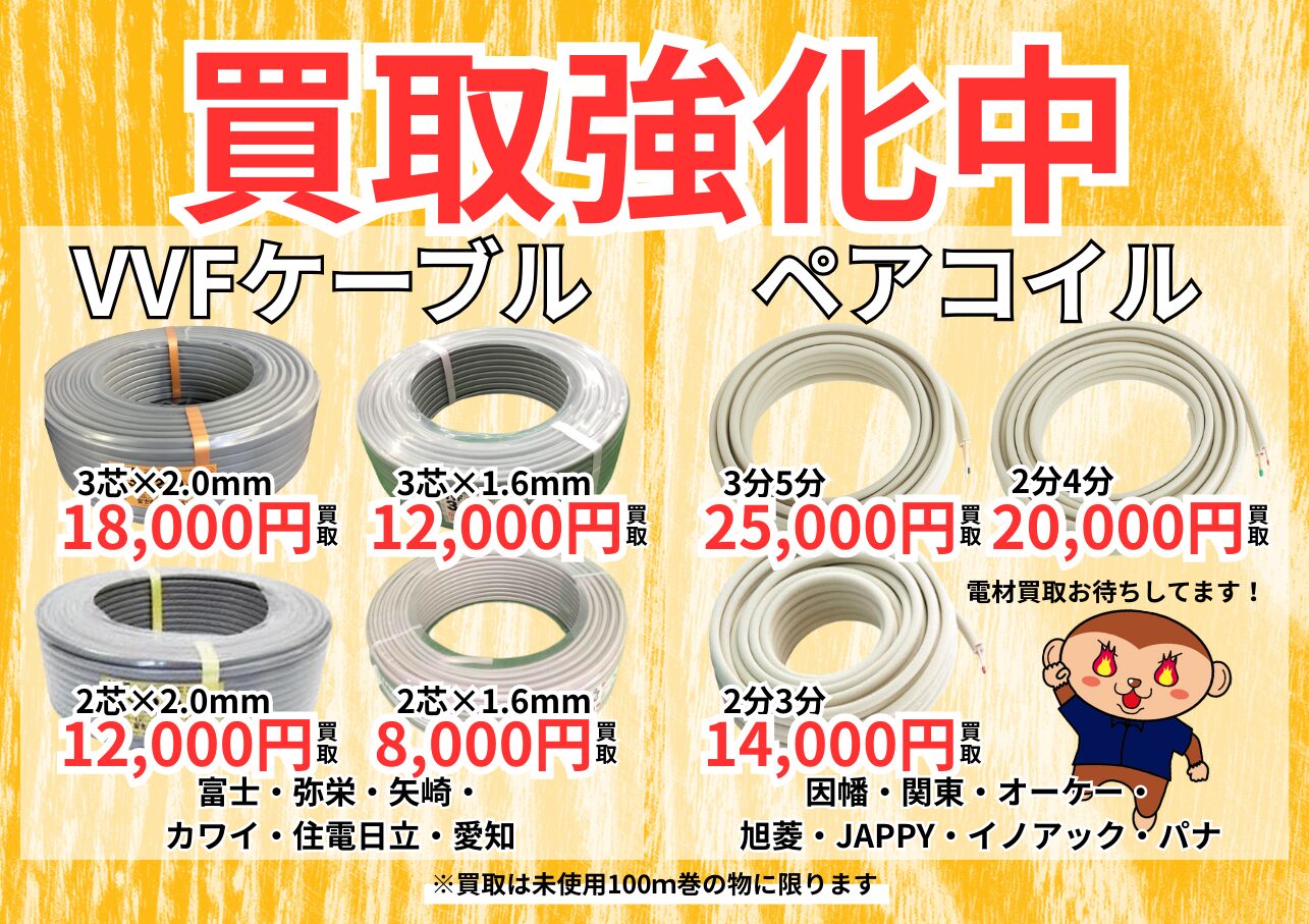 - VVFケーブルの買取は『新品・未使用品のみ』となります。